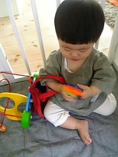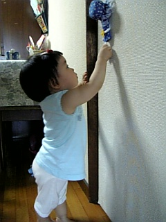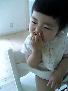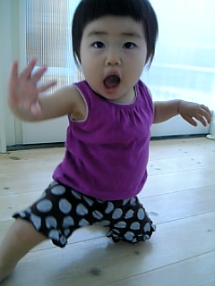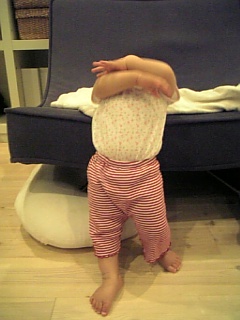 よくおもちゃをくわえて移動してます てんとう虫のメッシュバックを腕にかけて、おもちゃの携帯をいじりつつ立ち上がる・・・ 上体を後ろに倒す(イナバウアーのように) です。